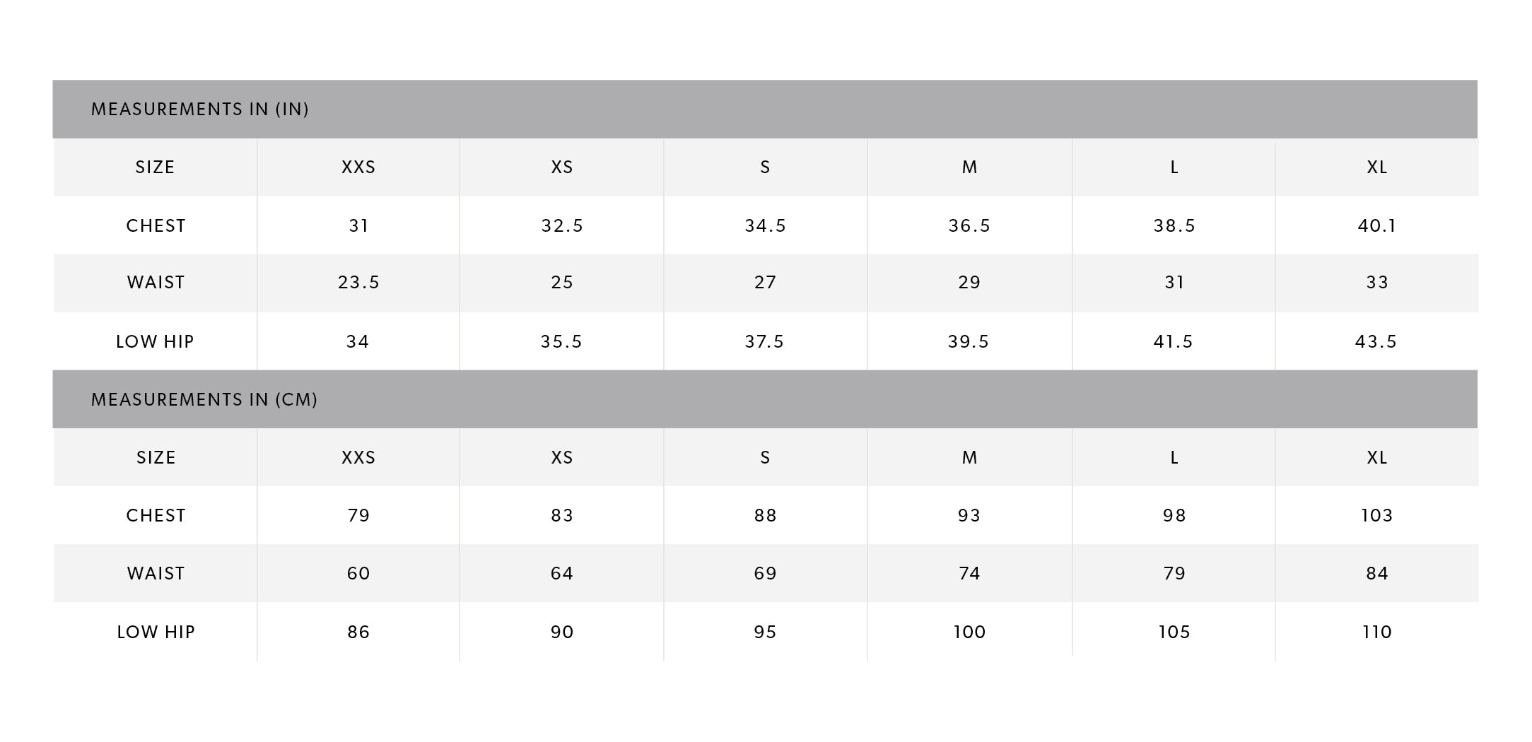Model Measurements: Height: 5'9.5", Bust: 32", Waist: 24.5", Hips: 33"
