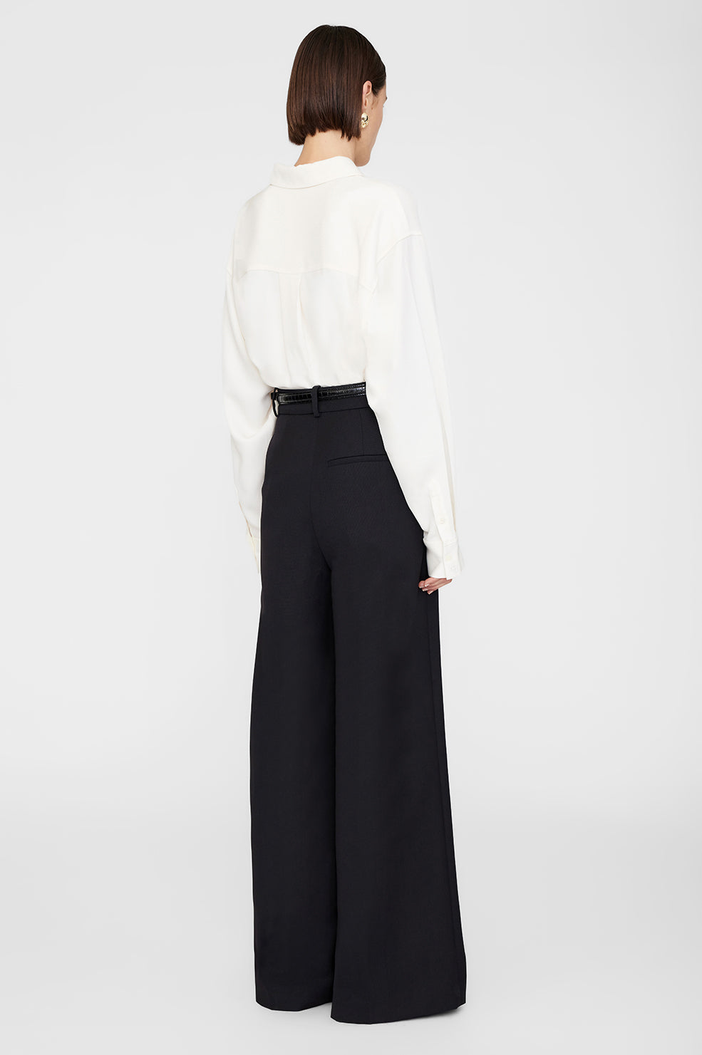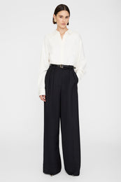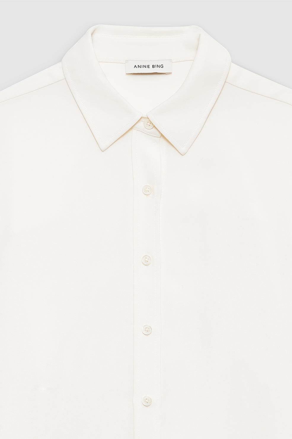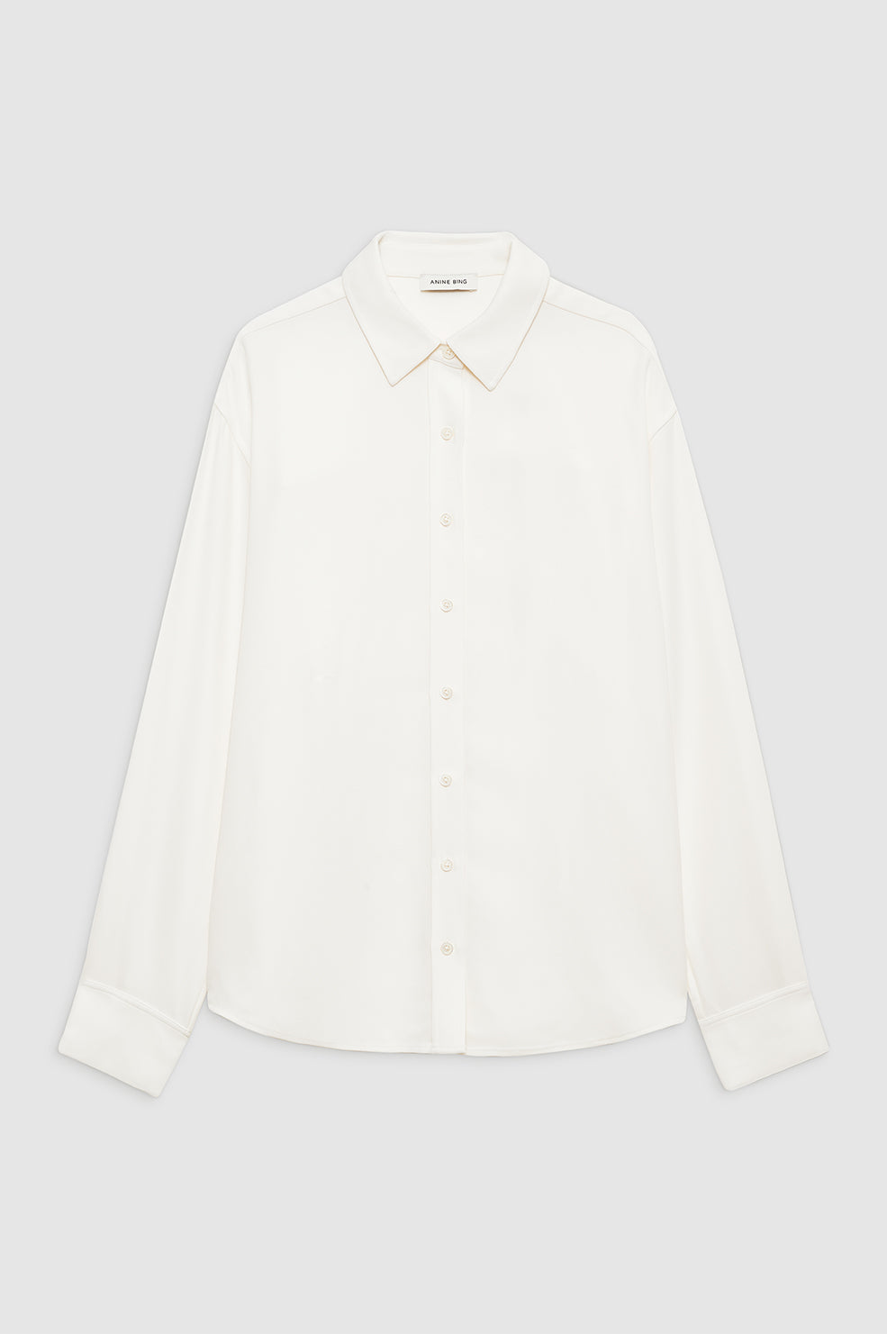 The Braxton Shirt is a menswear-inspired button-up made from a dry and drapey viscose crepe fabrication in ivory. Its oversized silhouette features dropped shoulder seams and back pleats for added shape. Finished with long sleeves secured by double-button detailing at each cuff.