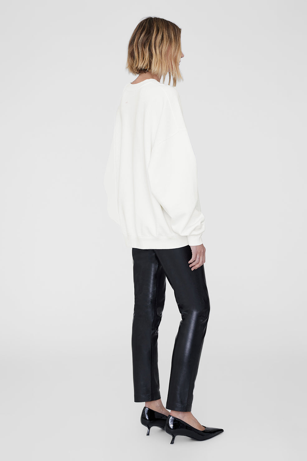 • The Miles Oversized Sweatshirt Letterman is an oversized crewneck pullover made from midweight 100% organic cotton fleece in off white. This relaxed casual features a custom ANINE BING letterman chenille patch graphic at the chest in black and cream.