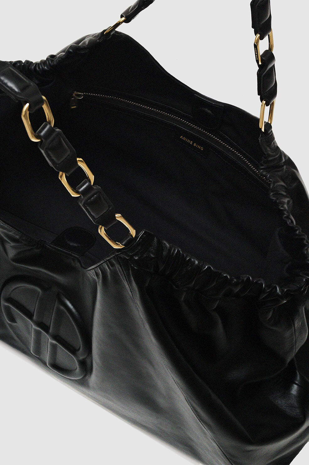 The Kate Tote is constructed from thin, slightly crinkled 100% Nappa leather. This iconic handbag features straps made of interlocked signature links in gold-tone hardware. Its oversized, carryall construction features a magnetic snap closure and elastic ruched side openings to reveal a large compartment with a single slip pocket and large zipper pocket. Finished with an embossed ANINE BING monogram at the front.