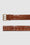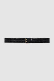 A thick, utility-inspired belt made from 100% leather stamped with faux croco-embossed texture in a high-shine finish. This modern style features a double-prong roller buckle in gold-tone hardware.