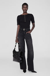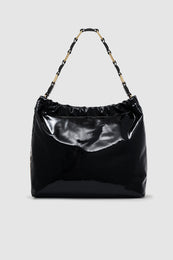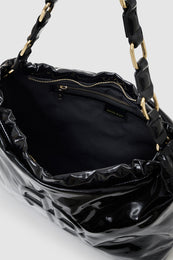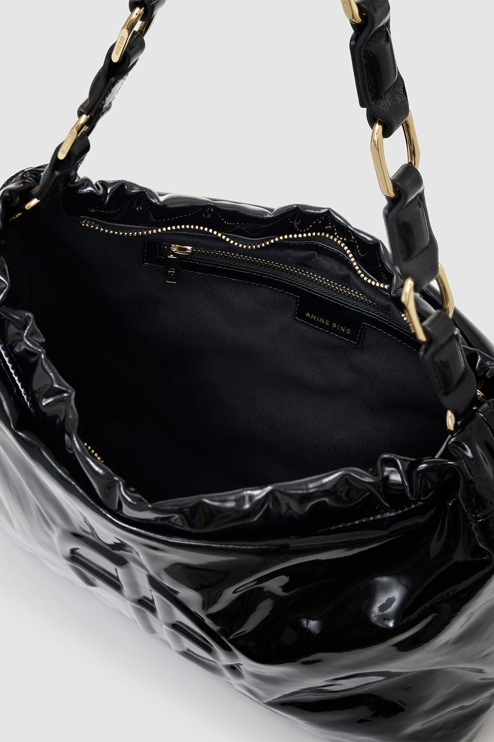 Inspired by the iconic Kate Tote, the Kate Shoulder Bag is constructed from 100% Nappa leather with a durable, high-shine black finish. This iconic silhouette features a strap made of interlocked signature links in gold-tone hardware. Its nostalgic construction includes a ruched elastic opening and top-zip closure to reveal a fully lined cotton-twill interior with a slip pocket and zipper pocket. Finished with an embossed ANINE BING monogram at the front.