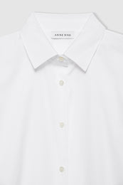 A classic tailored shirt made from a lightweight 100% cotton poplin fabrication with a crisp, structured look. The Essie Shirt's traditional construction includes slightly dropped shoulder seams, a discreet shirttail hem, and back yoke. Finished with mother of pearl buttons down the center front, double-button detailing at the cuff, and a hidden framed monogram embroidered within the front placket.