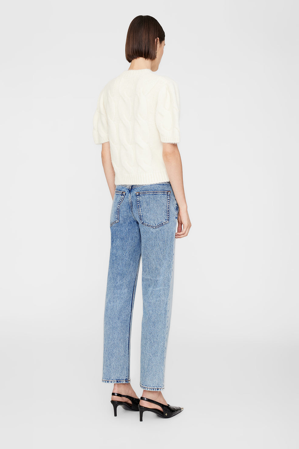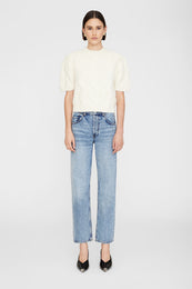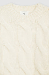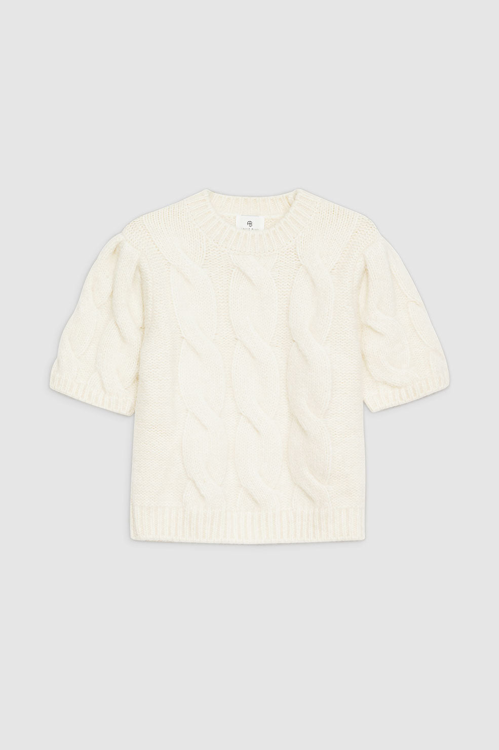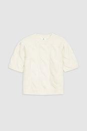 The Brittany Sweater is made from a heavyweight alpaca-wool yarn with an all-over cable stitch for a textured look and feel. It features a tight crew neckline and exaggerated puff short sleeves.