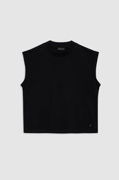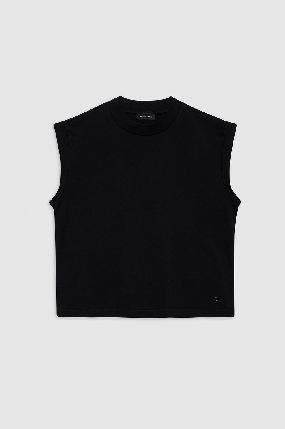 An elevated muscle tee crafted from a heavyweight cotton vintage jersey featuring a mock neckline and folded detailing at each sleeve. Finished with a small stitched ANINE BING monogram charm at the wearer's bottom-left hem.