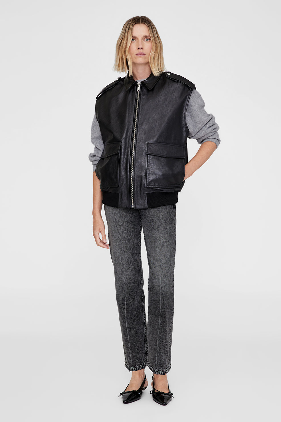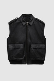 The Sonnie Vest is a fully lined, oversized layer constructed from heavyweight 100% leather with a slight sheen for a vintage look and feel. Featuring a branded leather zipper pull, antique silver hardware throughout, two large patch pockets with snap closures, and two hidden side pockets. Finished with ribbed trim along the hem.