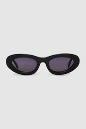 The Roma Sunglasses feature an oval, cat-eye shape with black acetate frames and grey gradient lenses polarized with UV400 protection. Accented with a gold-tone ANINE BING monogram at each temple.