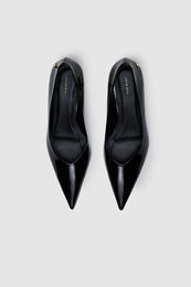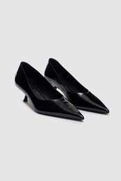 An elegant dress pump made from black patent leather with a high-shine finish. The Hilda Pumps' sleek construction features a sharp pointed toe, angular kitten heel, high-shine outsole, and cushioned insole. Accented with gold-tone ANINE BING hardware at each heel.