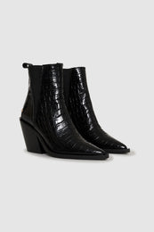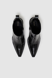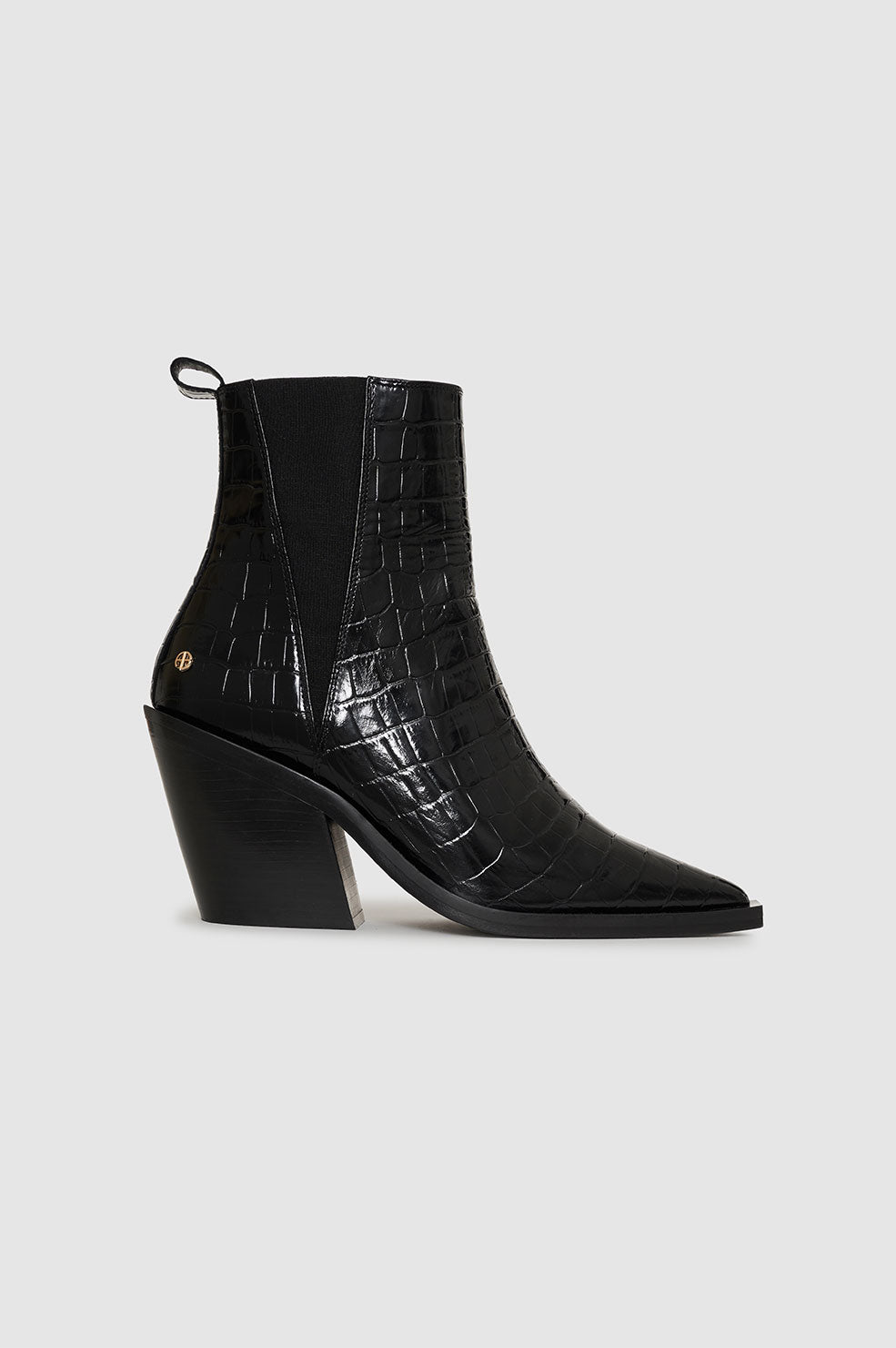 The Bekah Boots are crafted from shiny 100% leather stamped with faux croco-embossed texture. This statement pair features a subtle pointed toe framed by a sharp square-shaped outsole, slanted cuban heel, elastic gores, and back pull tabs. Complete with a cushioned insole and accented with gold-tone ANINE BING hardware at each heel.