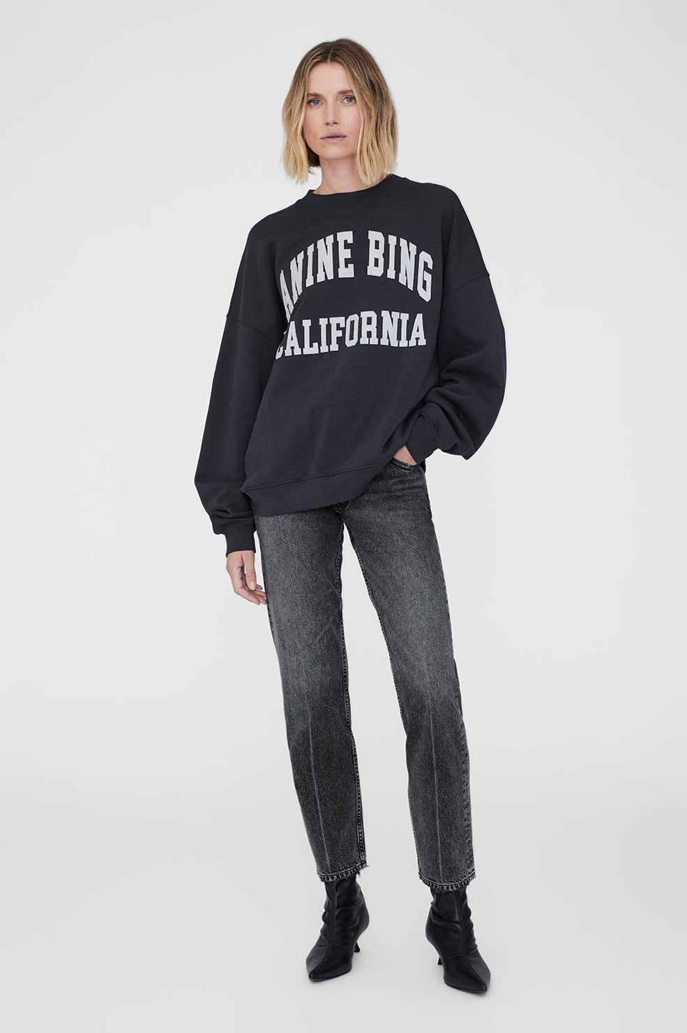 The Miles Sweatshirt ANINE BING is an oversized crewneck pullover made from midweight 100% organic cotton fleece in a vintage black wash. This relaxed casual features an original ANINE BING felt patch graphic at the chest in contrast white authentic collegiate lettering.