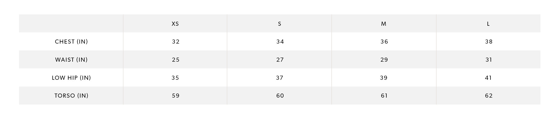 Model Measurements: Height: 5'9", Bust: 30", Waist: 23", Hips: 34"