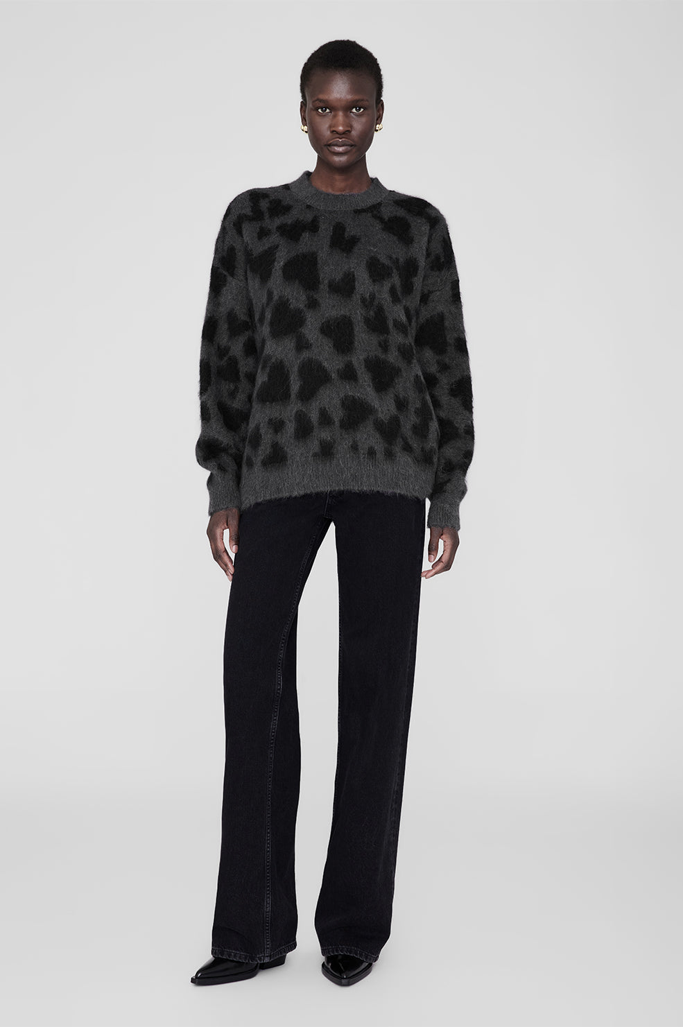 The Sydney Crew Sweater is a cozy yet sophisticated layer crafted in a heavyweight alpaca blend yarn featuring an all-over black and grey heart intarsia design. Finished with grey ribbed trim at the neck, cuff, and hem.