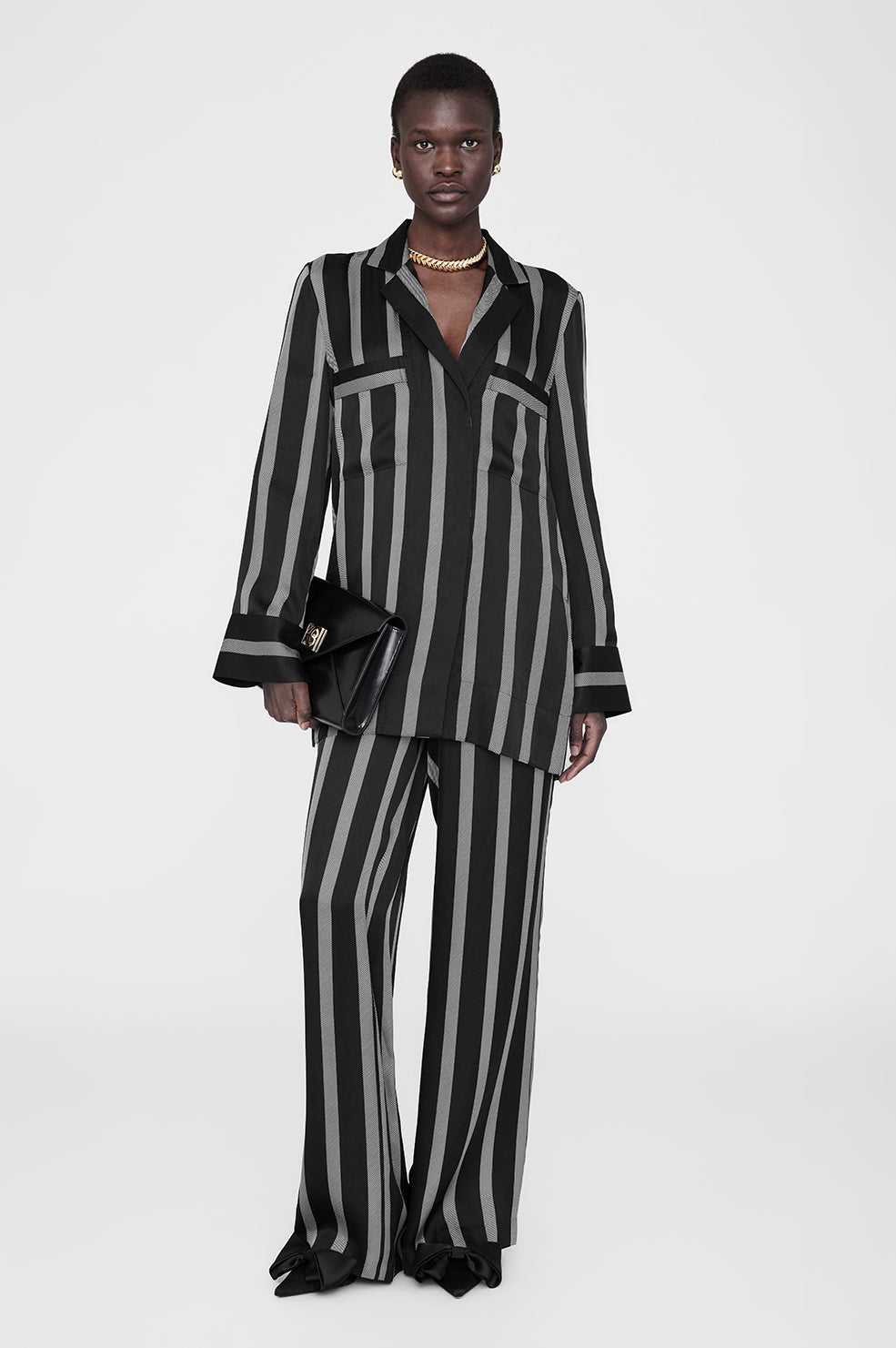 The Lynette Shirt is an elevated pajama-inspired style crafted in a 21 mm double-faced silk charmeuse blend in a black herringbone stripe pattern. Its straight, oversized silhouette features two breast pockets, concealed buttons at the cuff, and a slit at each side seam.