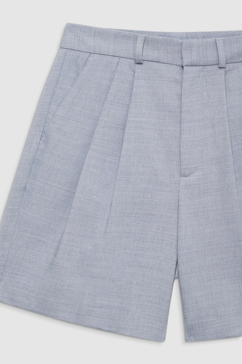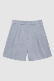 Inspired by the Carrie Pant, the Carrie Short is a pleated, trouser-inspired bottom constructed from a midweight, textured wool-viscose suiting fabrication in steel blue. This tailored style is fully lined and features five functional belt loops, two back welt pockets, slanted front pockets, and a single button zip-front closure.
