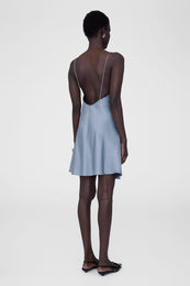 A mini-length, day-to-night slip dress constructed from a 25 mm double-faced silk charmeuse blend in peri blue. Its unlined, minimalist silhouette is cut on the bias and features round spaghetti straps with the option to tailor for a customizable fit.