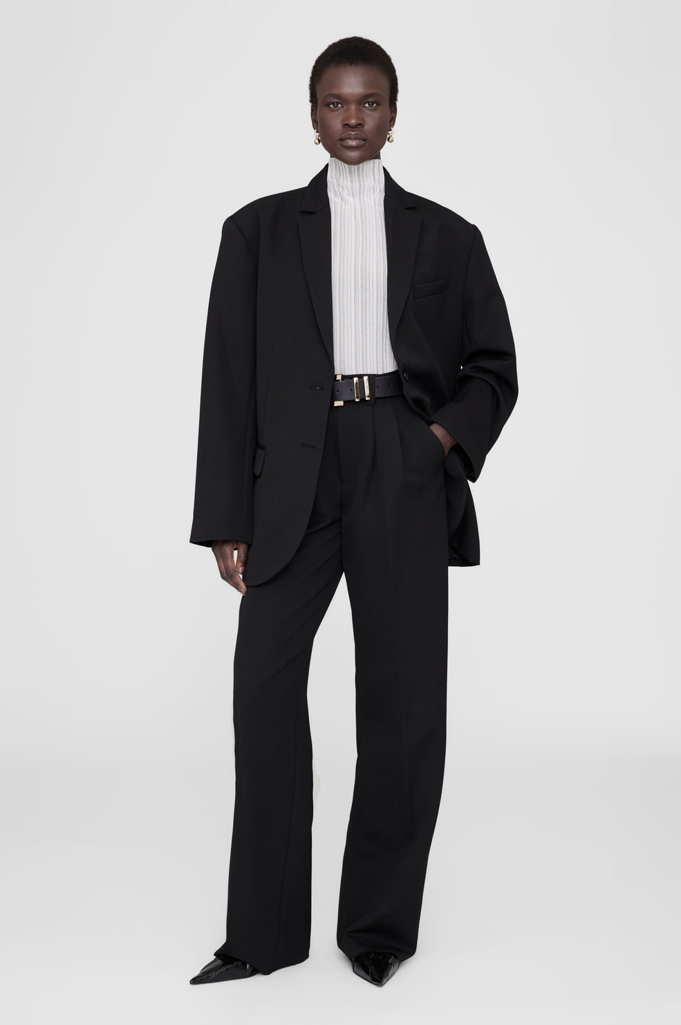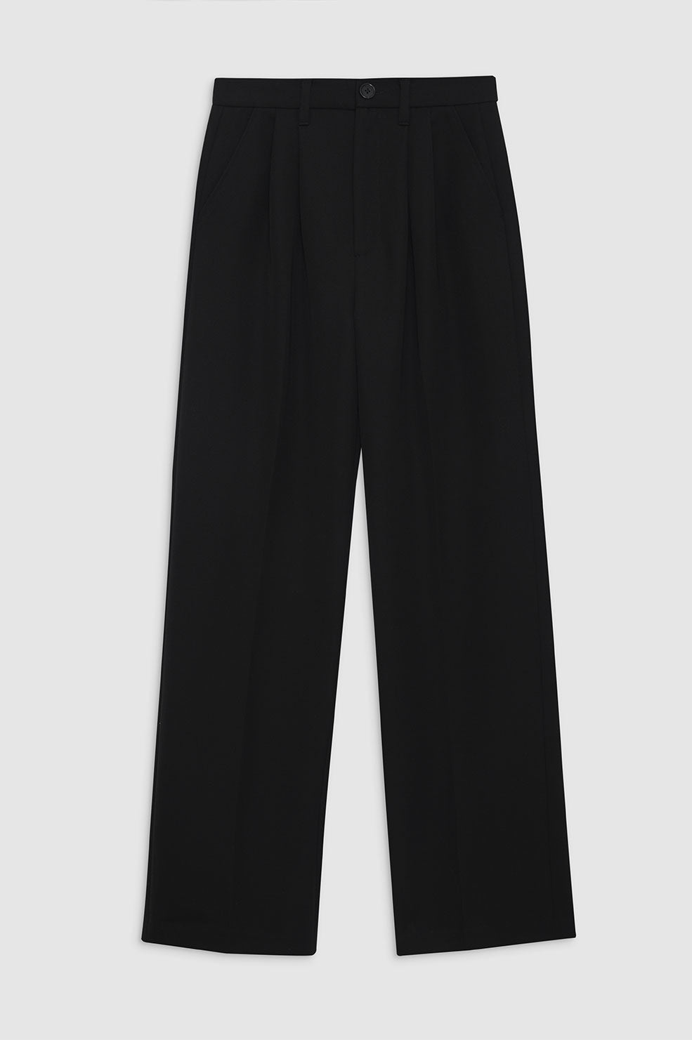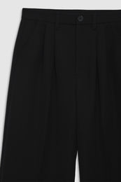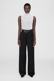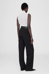 The Carrie Pant is a wide-leg trouser made from midweight 100% wool in black. This style is half lined to just below the wearer's knee and features double-pleated front detailing, five functional belt loops, two back welt pockets, slanted front pockets, and a single button zip-front closure.