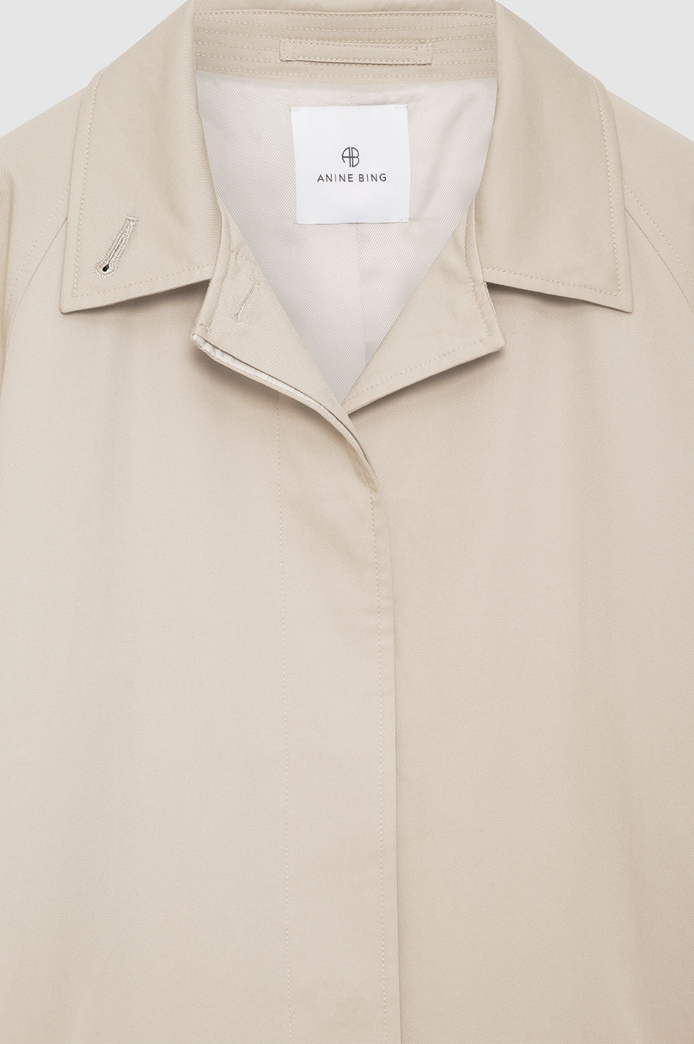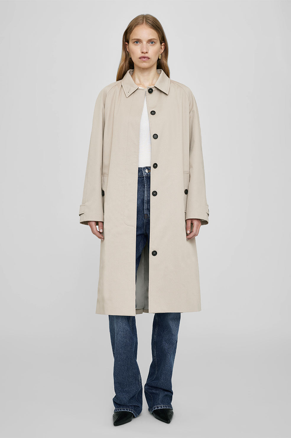 A menswear-inspired trench coat made from a fully lined, lightweight cotton-twill fabrication with a water-resistant finish. This transitional layer features an oversized silhouette with concealed horn buttons down its center-front opening and button tab closures at the wrist. Two large welt pockets and discrete interior pockets add to its overall practical construction.