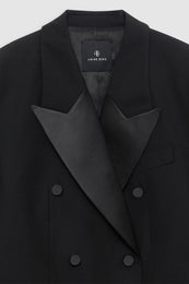 A tuxedo-style dress crafted from midweight 100% wool with a clean look and soft hand. The Ross Dress has a boxy silhouette featuring satin lapels, a double-breasted closure with satin-covered buttons, and sharp, constructed shoulder pads. Finished with one welt chest pocket, two flap pockets at the hips, two interior pockets, and four-button cuffs.